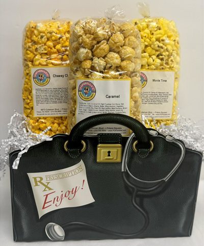 This box comes with three (6 cup) bags of Movie Time, Cheesy Cheese, and Caramel – all best sellers! Gift is then packaged with shredded confetti, wrapped in a clear cello bag, heat sealed and tied with a ribbon for a beautiful presentation.
