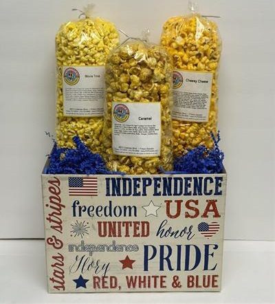 This box comes with three (6 cup) bags of Movie Time, Cheesy Cheese, and Caramel – all best sellers! Gift is then packaged with shredded confetti, wrapped in a clear cello bag, heat sealed and tied with a ribbon for a beautiful presentation.